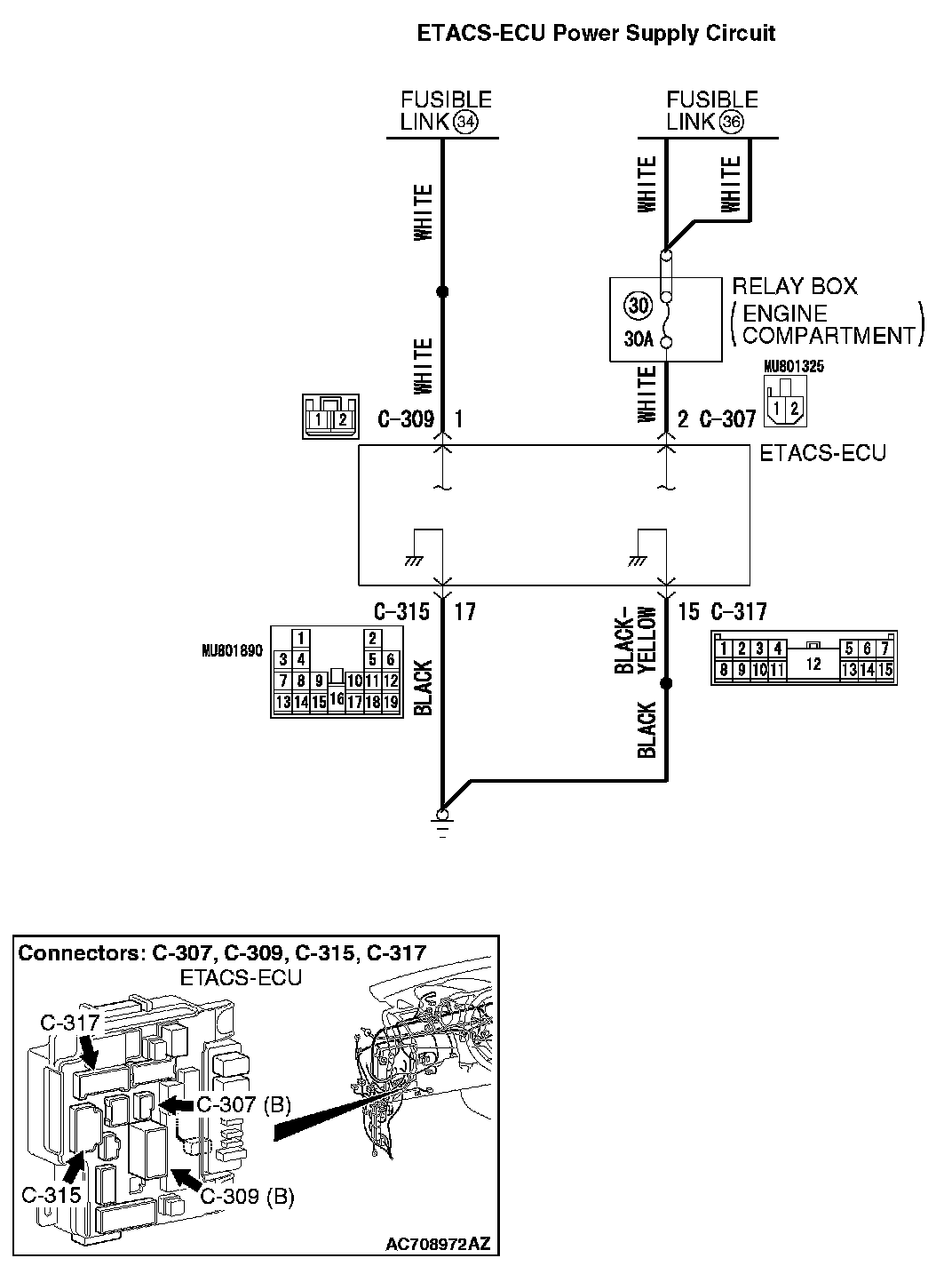 STEP 6. Check the wiring harness between ETACS-ECU connectors C-307 (terminal 2) or C-309 (terminal 1) and the fusible link (36) or (34).