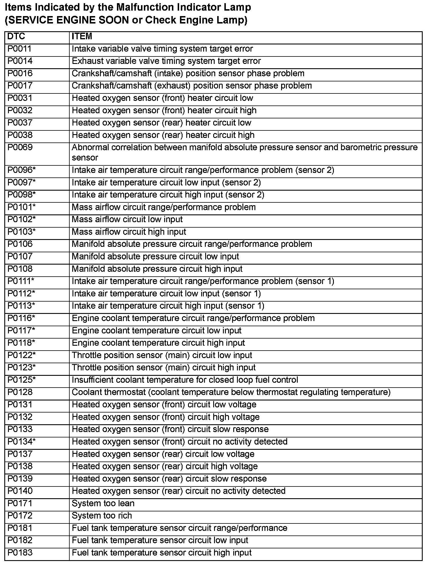 Items Indicated by the Malfunction Indicator Lamp