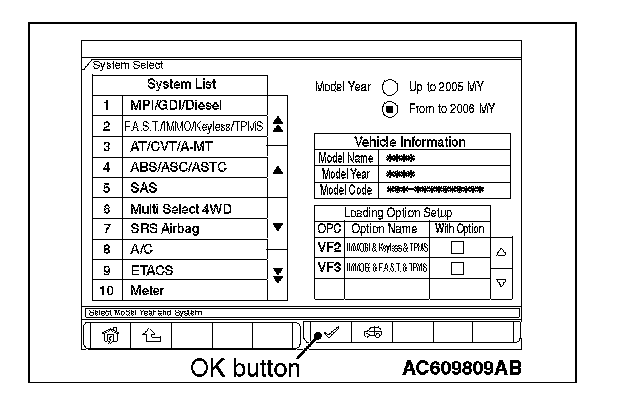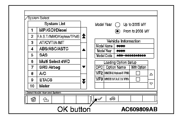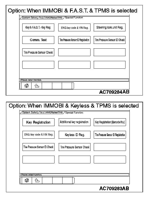 8. Select "F.A.S.T./IMMO/Keyless/TPMS" button from the "System Select" screen. Then, select the applicable option code item and push the OK button.