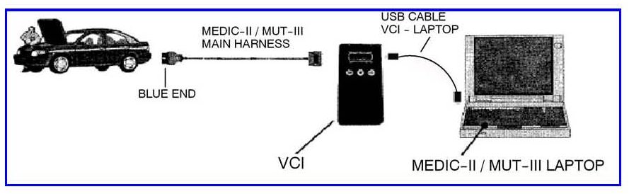 ^ Connect the MUT-III main harness with the blue DLC connection to the VCI.