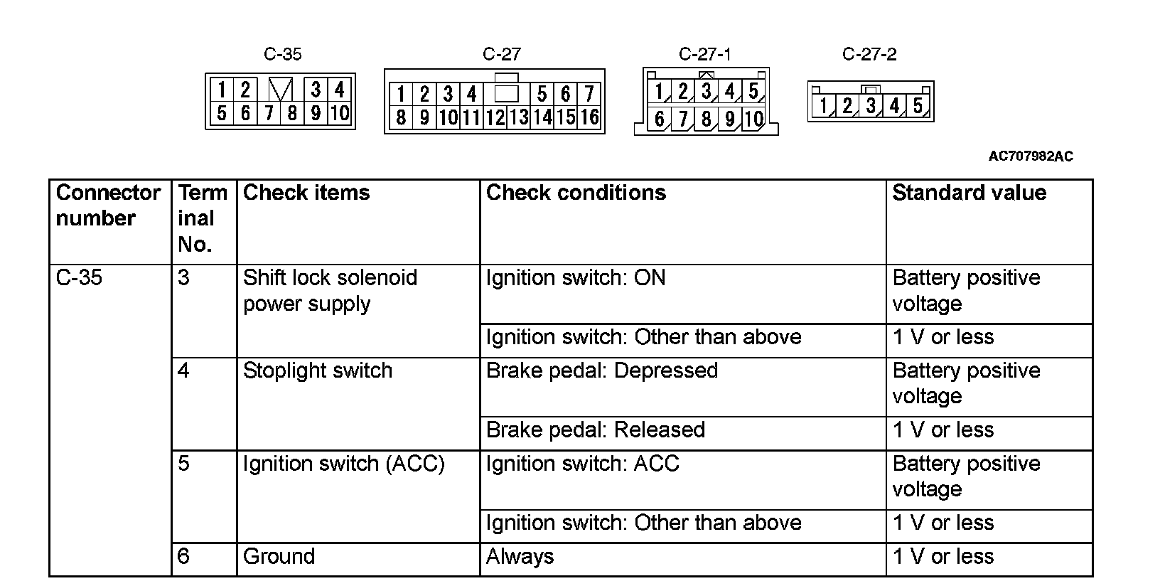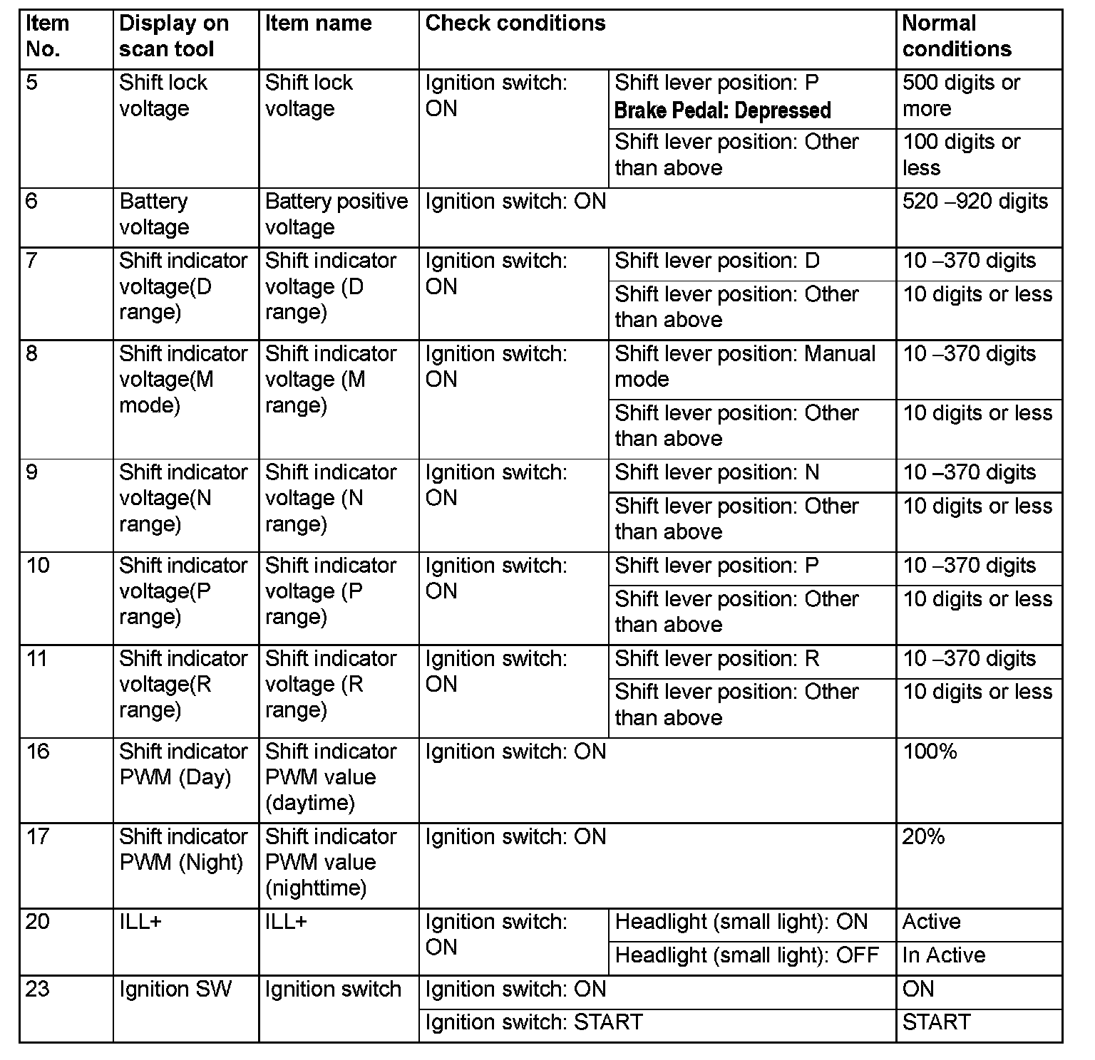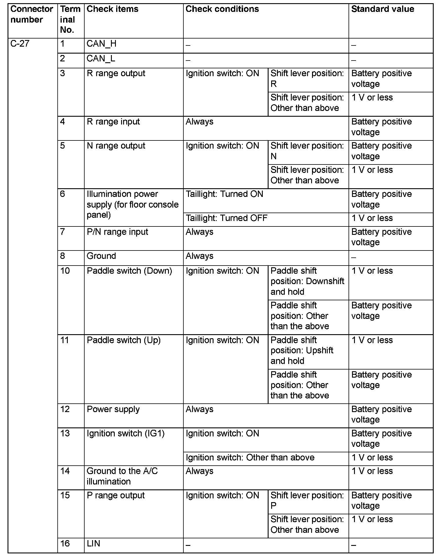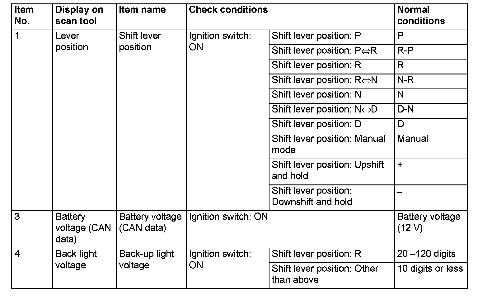 SHIFT LEVER-ECU TERMINAL VOLTAGE REFERENCE CHART
