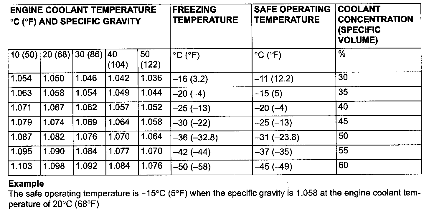 - If the concentration of the coolant is below 30%, the anti-corrosion property will be adversely affected. In addition, if the concentration is above 60%, both the antifreeze and engine cooling properties will decrease, affecting the engine adversely. For these reasons, be sure to maintain the concentration level within the specified range.