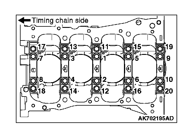Tighten crankshaft bearing cap bolts to the specified torque according to the tightening order.