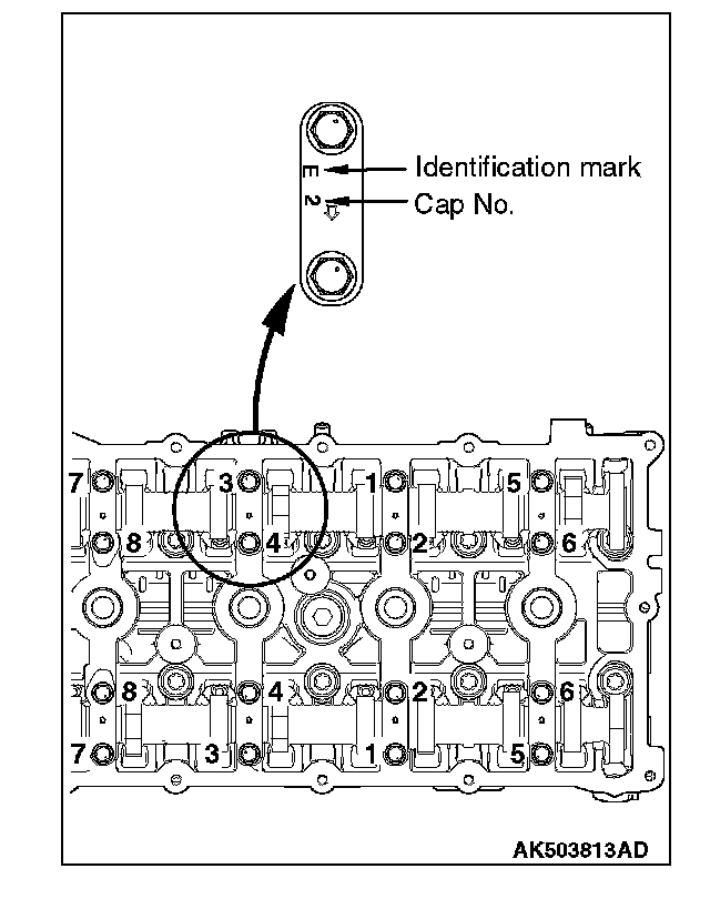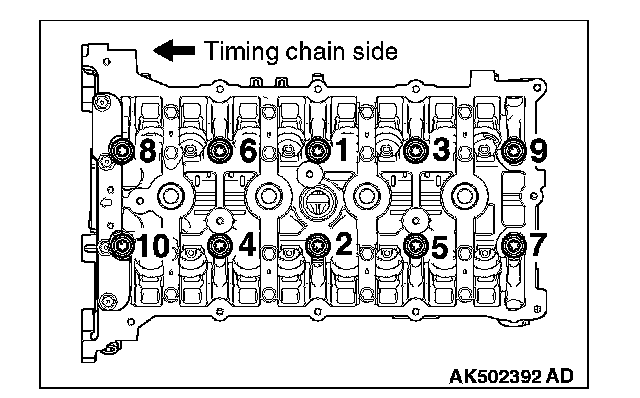 Tighten each camshaft bearing cap mounting bolt to the specified torque in the order of number shown in the figure in two or three steps.