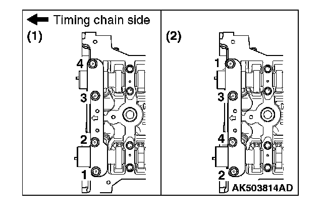 Tighten each front camshaft bearing cap mounting bolt to the specified torque in the order shown 2).