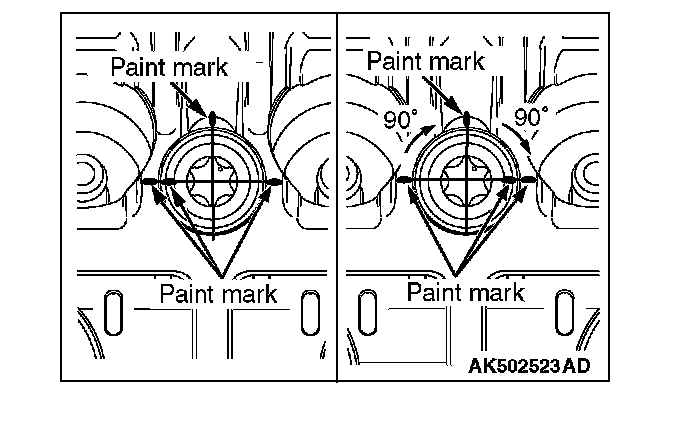 Tighten it further 90° and make sure that the paint mark on the cylinder head bolt is in a straight line with that on the cylinder head.