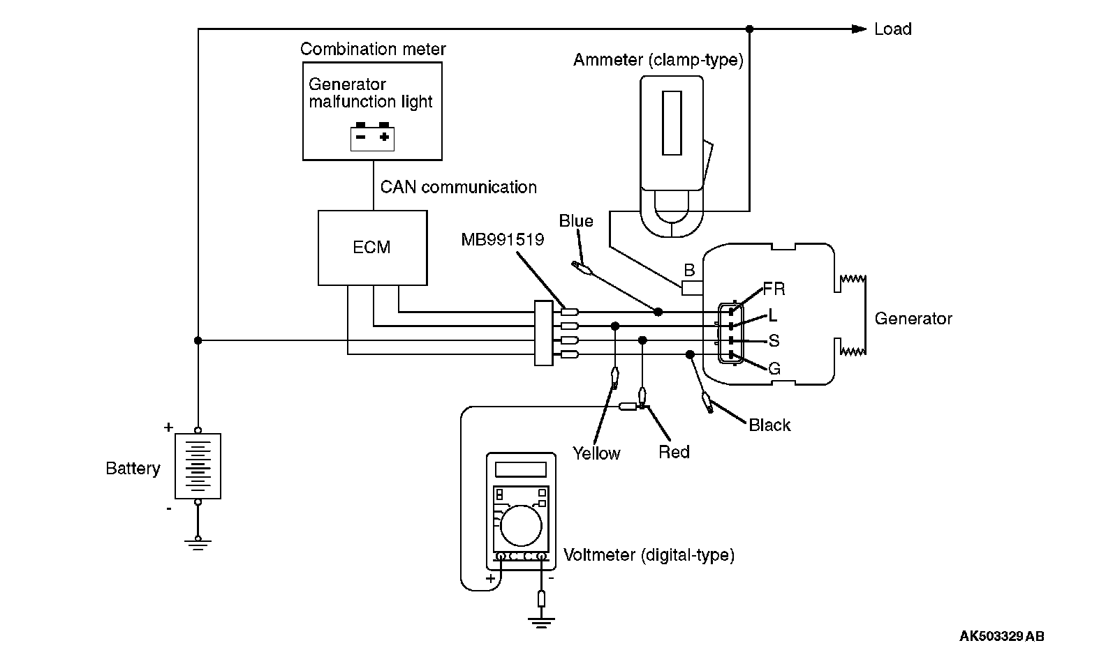 4. Use the special tool (Generator harness connector: MB991519) to connect a digital-type voltmeter between the generator "S" terminal and ground. (Connect the positive lead of the voltmeter to the "S" terminal, and then connect the negative lead of the voltmeter to a secure ground or to the negative battery terminal.)