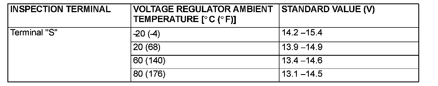 If the voltage is outside the standard value, there is a malfunction of the voltage regulator or the generator (Refer to the following table).