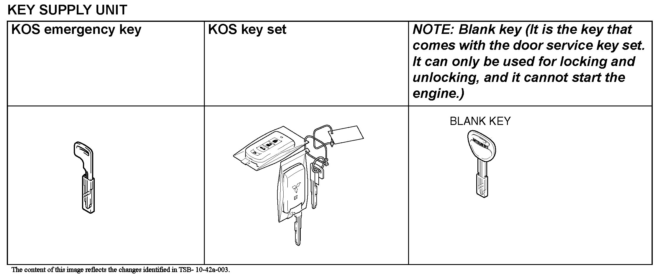 The individual unique ID code is stored in the transponder (small transmitter) and KOS-ECU, engine control module (ECM), keyless operation key, and steering lock unit for KOS. Under the conditions shown in the table, the corresponding ID code has to be registered with KOS-ECU or the ECM again.