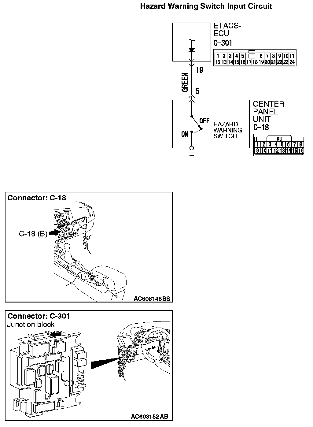 STEP 4. Check the wiring harness between center panel unit connector C-18 (terminal 5) and ETACS-ECU connector C-301 (terminal 19).