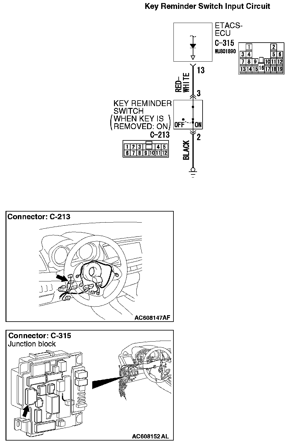STEP 6. Check the wiring harness between key reminder switch connector C-213 (terminal 3) and ETACS-ECU connector C-315 (terminal 13).