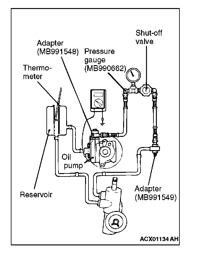 1. Disconnect the pressure hose from the oil pump, and then connect the special tools MB991548, MB990662 and MB991549.