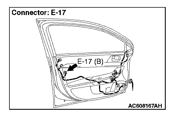 Disconnect front door lock actuator (LH) connector E-17. Then check continuity between the terminals.