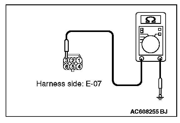 1. Disconnect front door lock actuator (RH) connector E-07 and measure the resistance available at the wiring harness side of the connector.