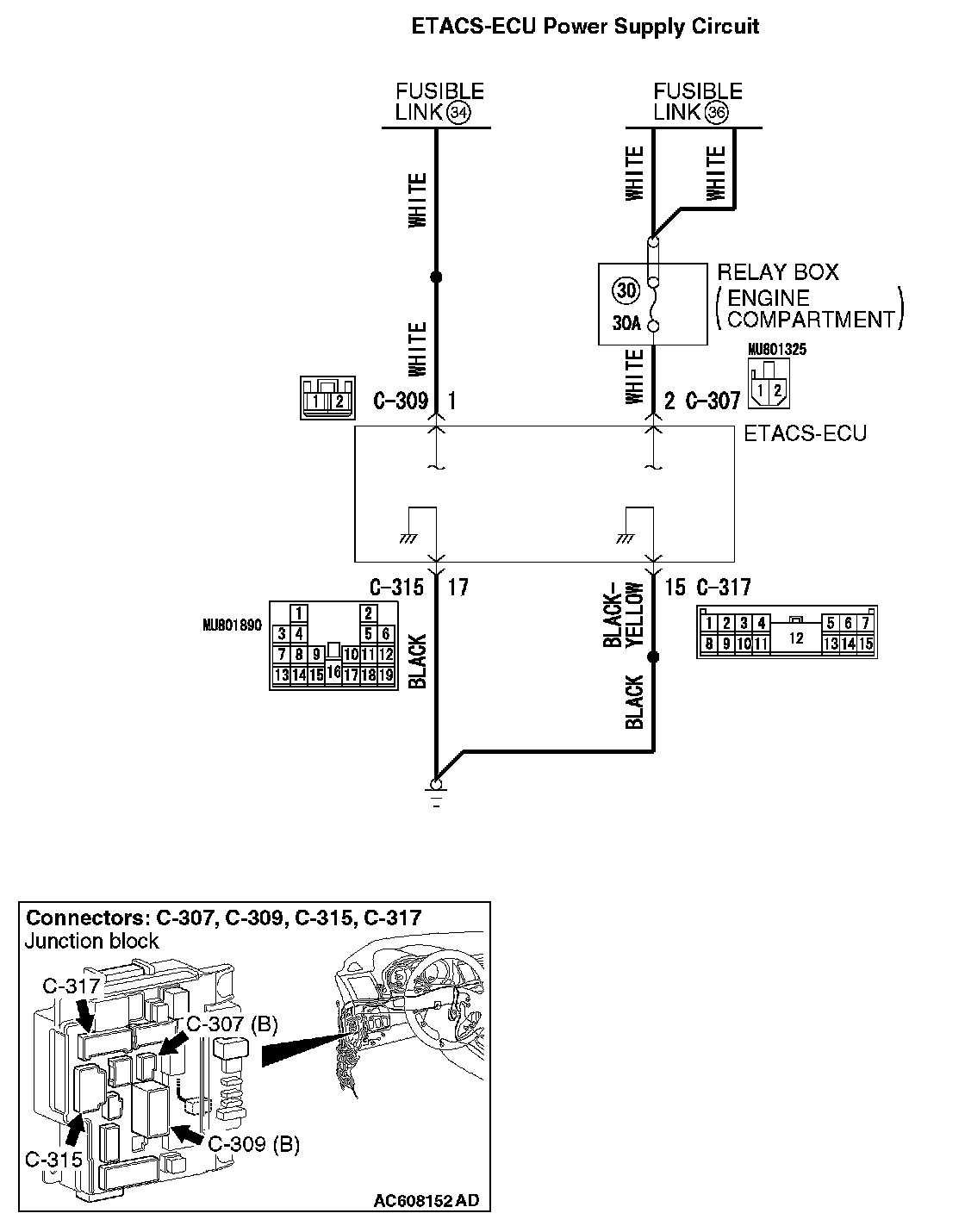 STEP 6. Check the wiring harness between ETACS-ECU connectors C-307 (terminal 2) or C-309 (terminal 1) and the fusible link (36) or (34).