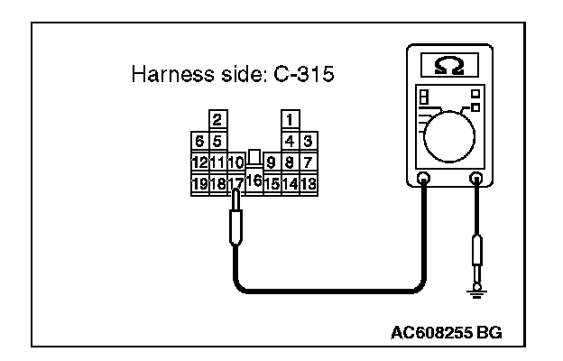 2. Measure the resistance value between ETACS-ECU connector C-315 terminal 17 and ground.