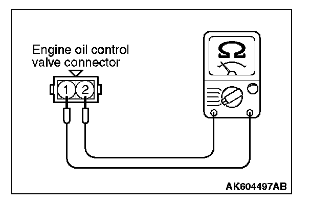 2. Measure resistance between terminal No. 1 and terminal No. 2 of the connector at the engine oil control valve side.
