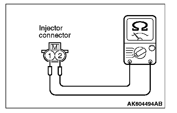 Measure the resistance between injector side connector terminals 1 and 2.