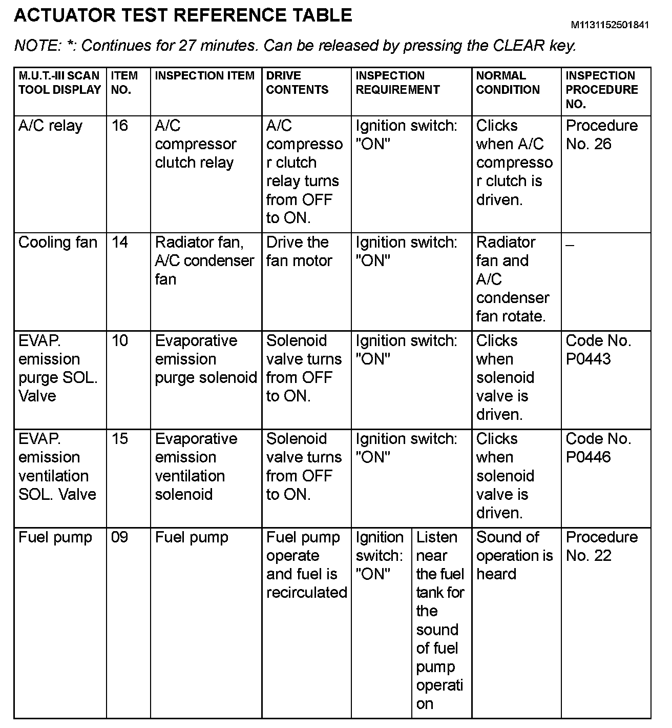 Actuator Test Reference Table (Part 1):