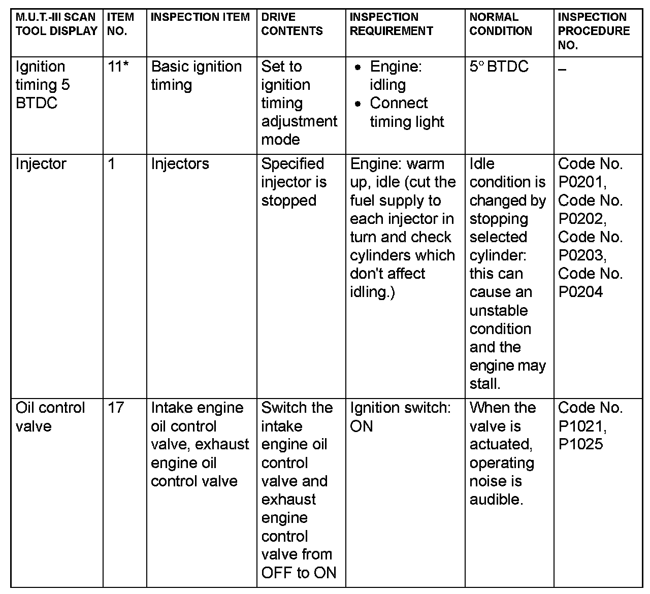 Actuator Test Reference Table