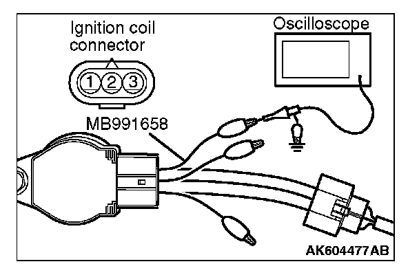 1. Disconnect the ignition coil connector, and connect test harness special tool (MB991658) between the separated connector. (All terminals should be connected.)