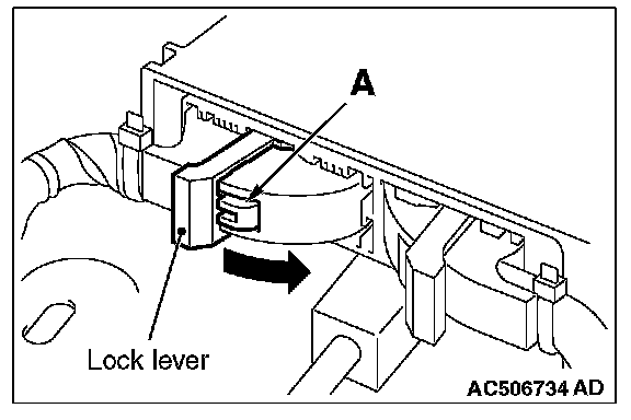 While pushing the part "A" indicated in the figure of the harness side connector, turn the lock lever to the direction of the arrow to release the lock lever.