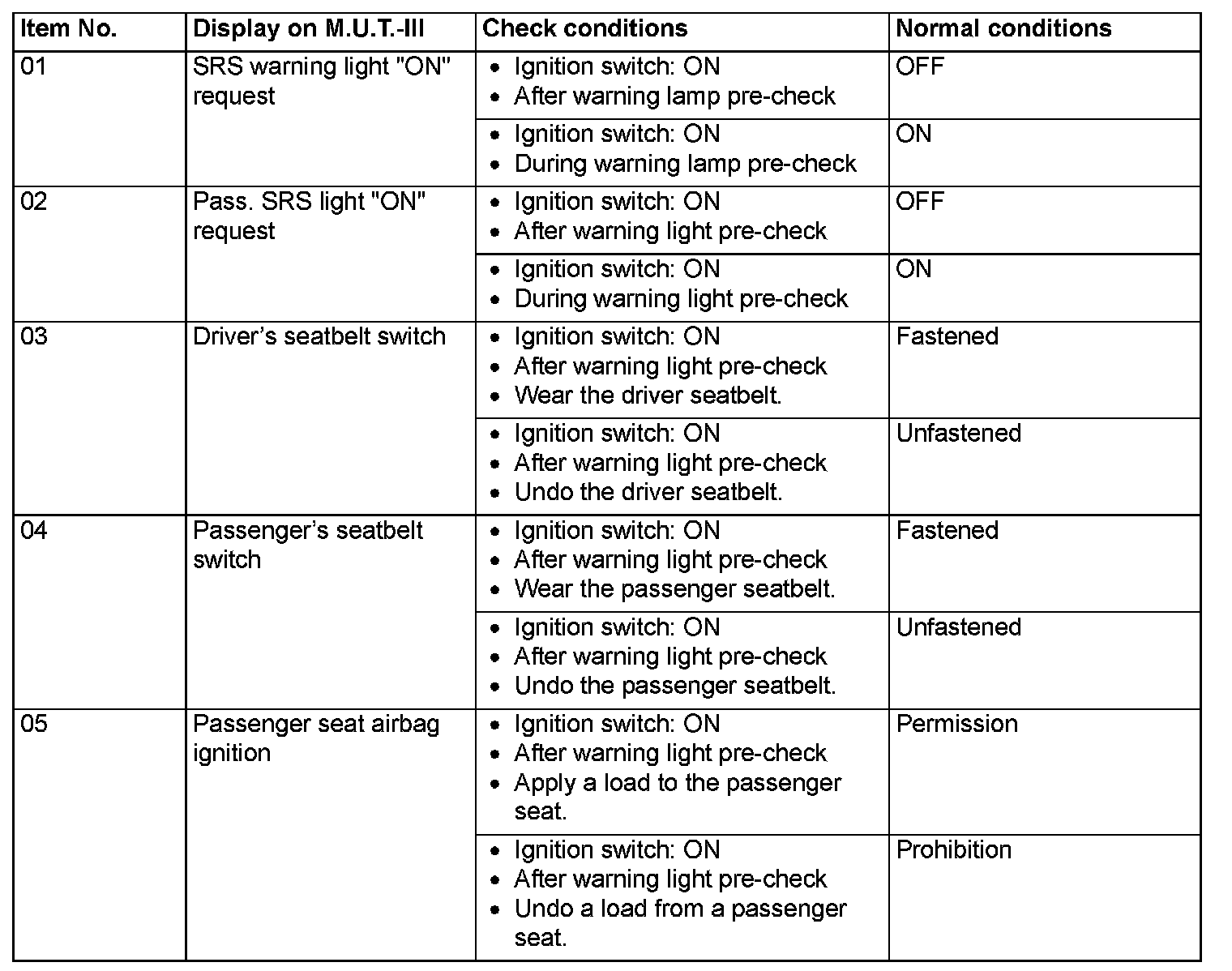 The following items can be read by the scan tool from the SRS-ECU input data.