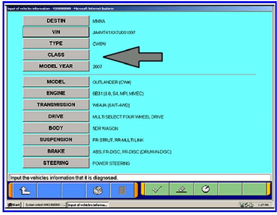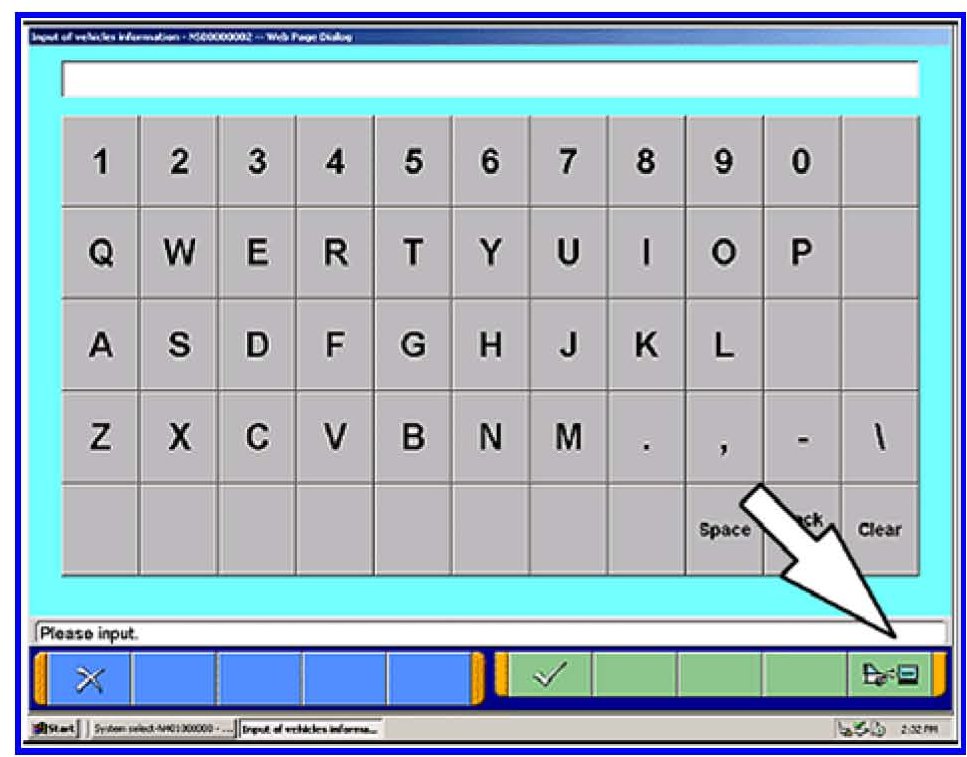 6. Click the car icon at the lower RH corner of the screen to have the MUT III automatically input the VIN. If a message appears stating that the VIN cannot be completed automatically, manually type the 17 digit VIN into the VIN field or click the individual characters on the on-screen keyboard.