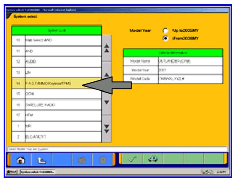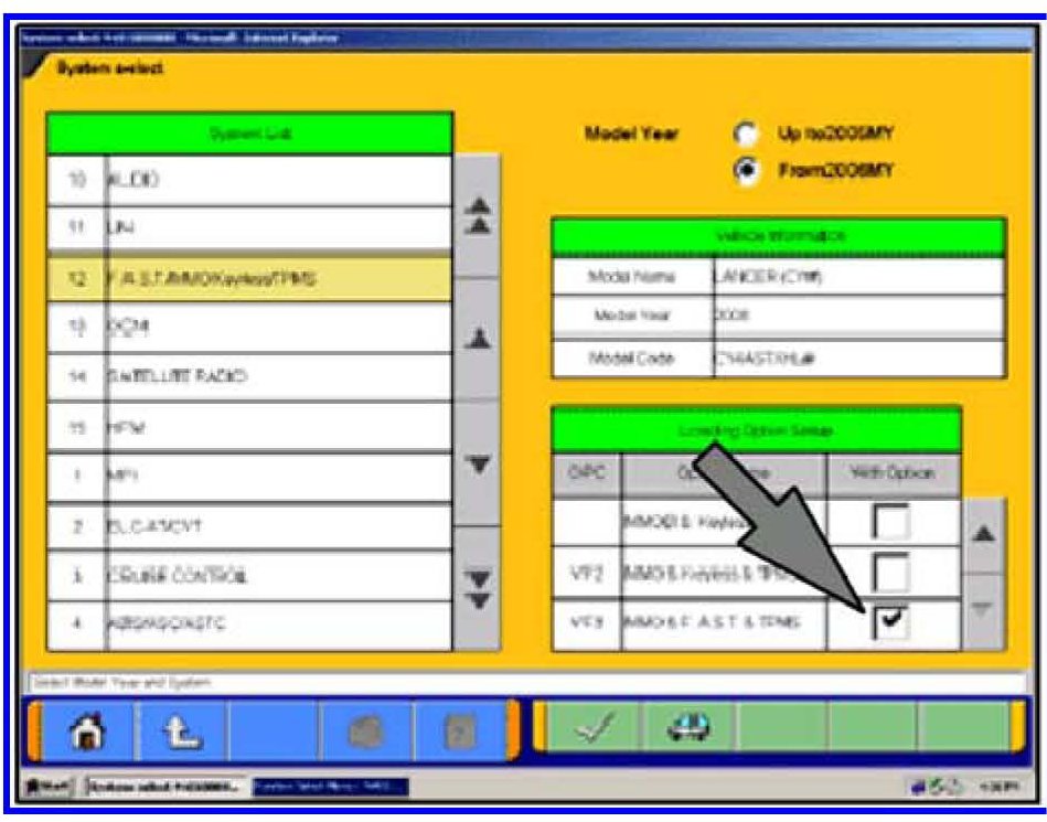 5. The check mark at the bottom of the page WILL NOT be 'active' (bright). Scroll to F.A.S.T./IMMO/Keyless/ TPMS and select that line. Go to Step 6.