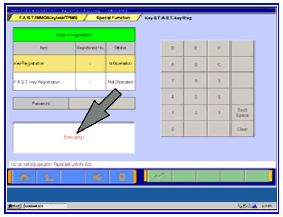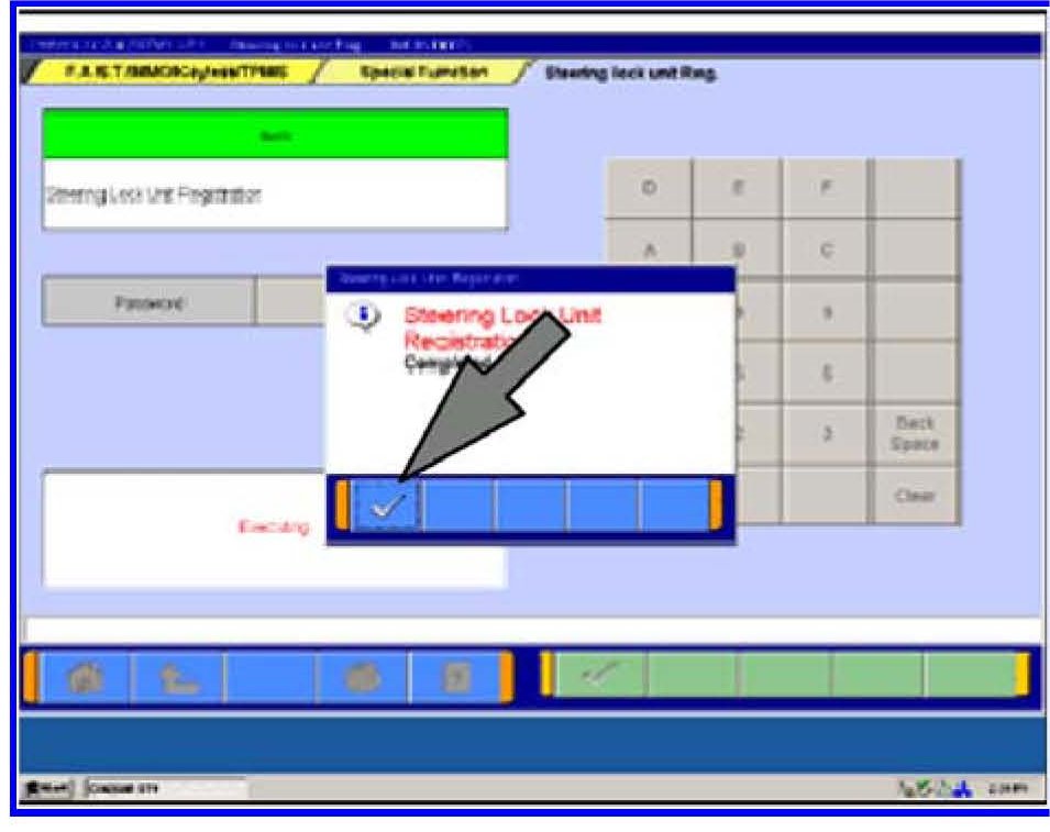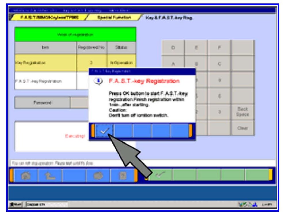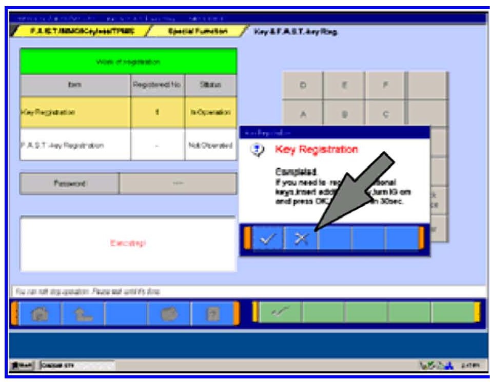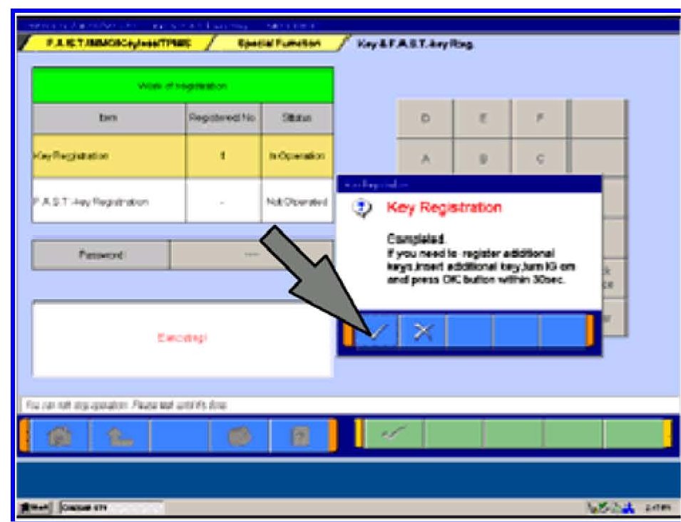 5. When registration of the 1st key is completed, an audible tone is heard and this screen is displayed. You will also notice that the Registered No. will change to the next increment. Remove the key from the ignition and insert the next key. Click the check mark to register the next key. You must switch keys within 30 seconds or the process will fail and you must start over from the beginning.