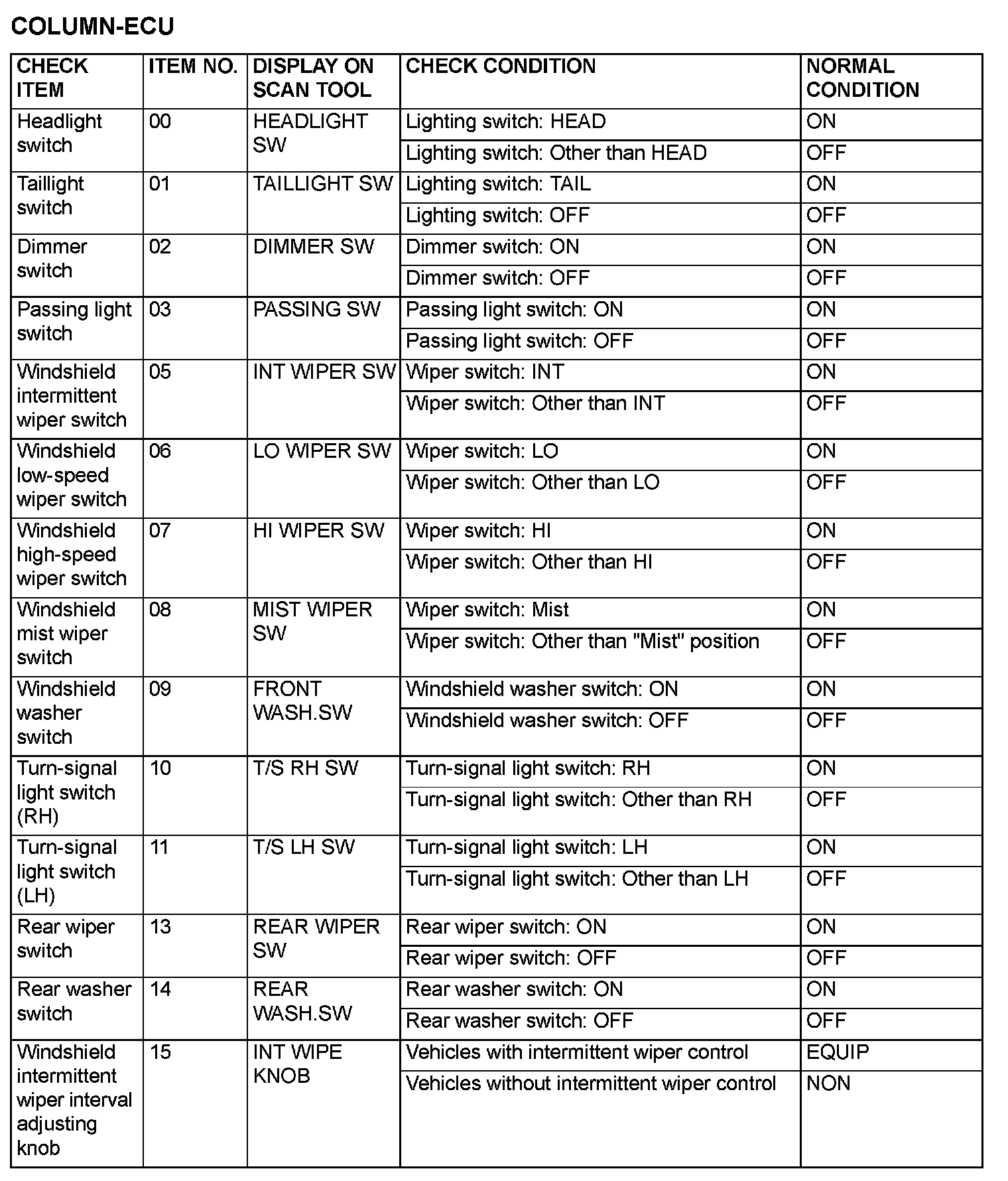 Data List Reference Table - COLUMN-ECU: