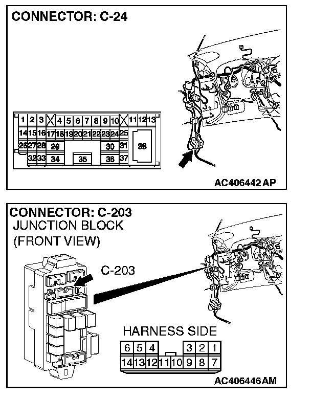 NOTE: Also check intermediate connector C-24 and junction block connector C-203 for loose, corroded, or damaged terminals, or terminals pushed back in the connector. If intermediate connector C-24 or junction block connector C-203 is damaged, repair or replace the damaged component(s) as described.