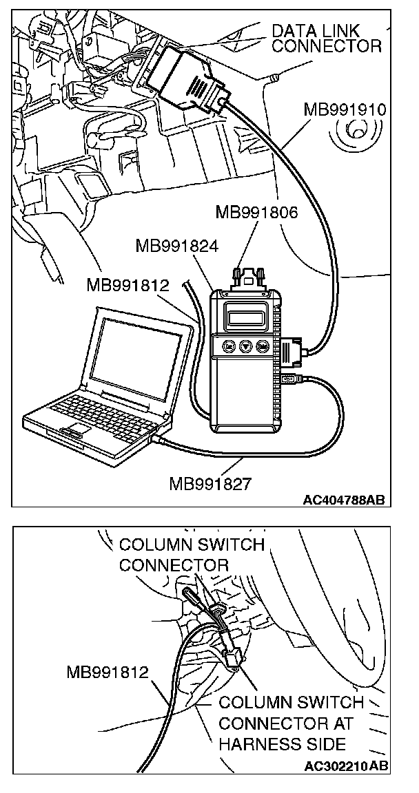 CAUTION: To prevent damage to scan tool MB991958, always turn the ignition switch to the "LOCK" (OFF) position before connecting or disconnecting scan tool MB991958. Connect special tool MB991910 before connecting special tool MB991812. Be sure to connect special tool MB991806 after turning on special tool MB991824.