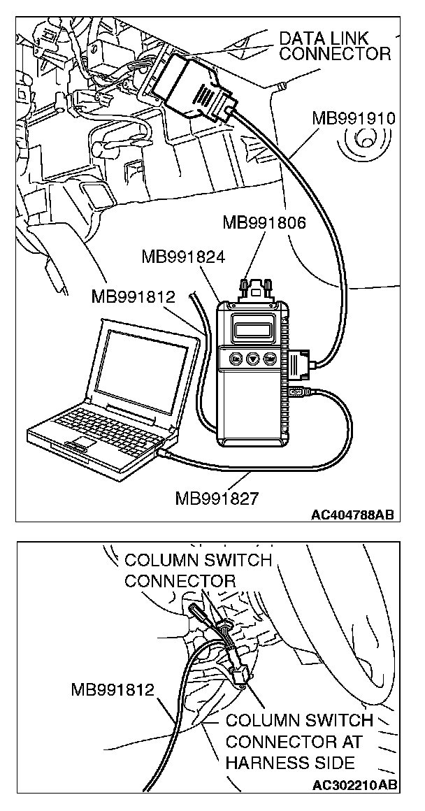 CAUTION: To prevent damage to scan tool MB991958, always turn the ignition switch to the "LOCK" (OFF) position before connecting or disconnecting scan tool MB991958. Connect special tool MB991910 before connecting special tool MB991812. Be sure to connect special tool MB991806 after turning on special tool MB991824.