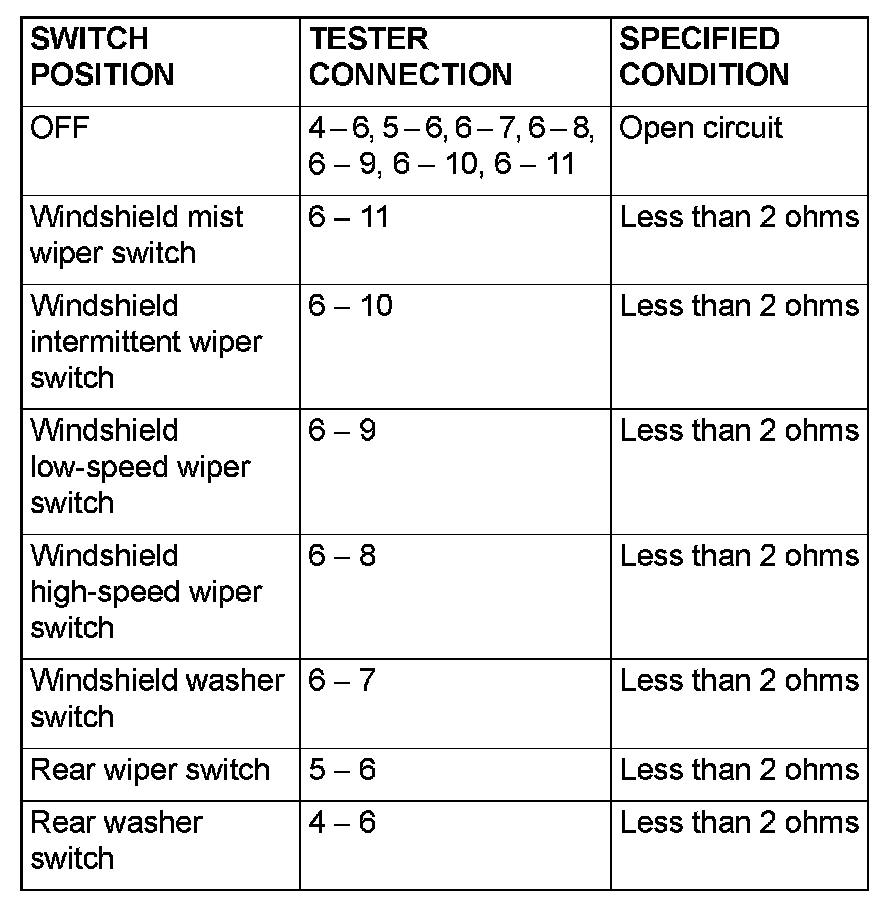 Remove the wiper and washer switch. Then check continuity between the switch terminals.