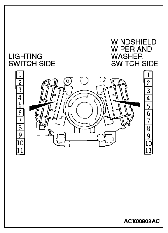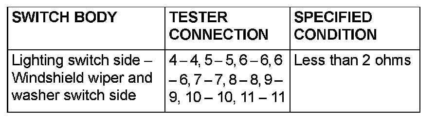 Remove the turn-signal light and lighting switch and windshield wiper and washer switch. Then check continuity between the switch body terminals.