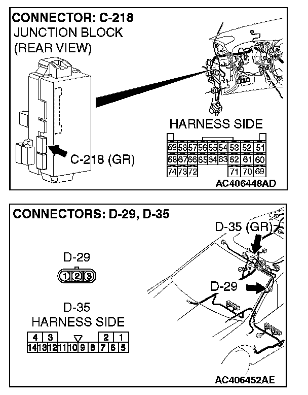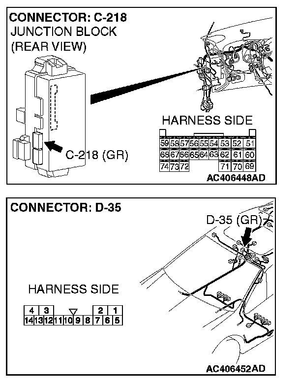 STEP 2. Check sunroof motor assembly connector D-35 and ETACS-ECU connector C-218 for loose, corroded or damaged terminals, or terminals pushed back in the connector.