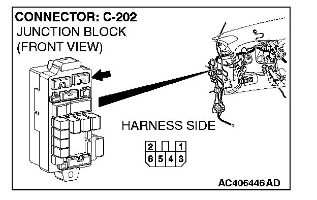 NOTE: Also check junction block connector C-202 for loose, corroded, or damaged terminals, or terminals pushed back in the connector. If junction block connector C-202 is damaged, repair or replace the damaged component(s) as described.