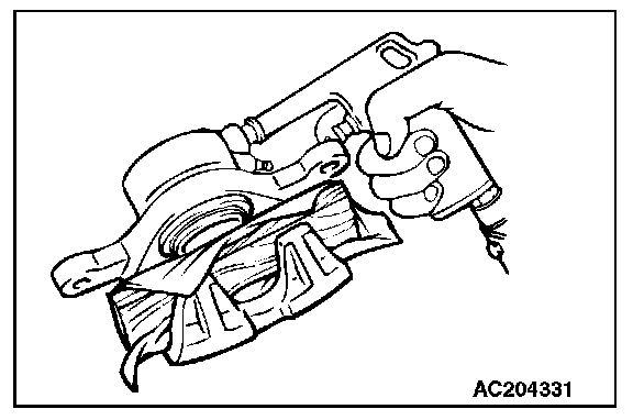 Place a piece of wood, etc. against the caliper body as shown. Blow compressed air through the brake hose connection hole to remove the piston boot and piston.