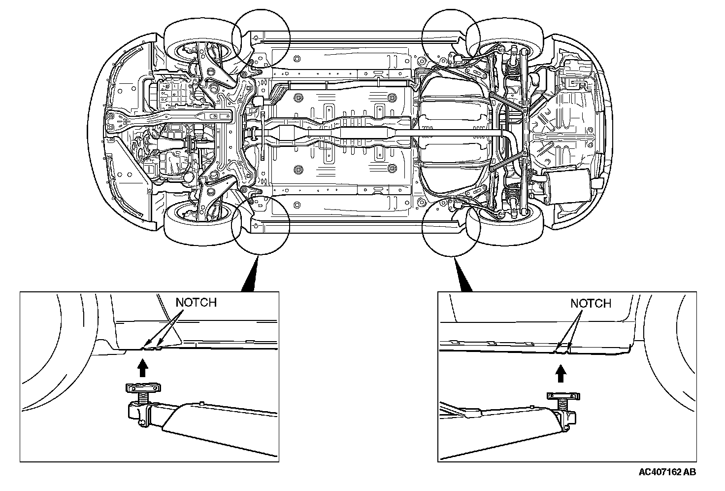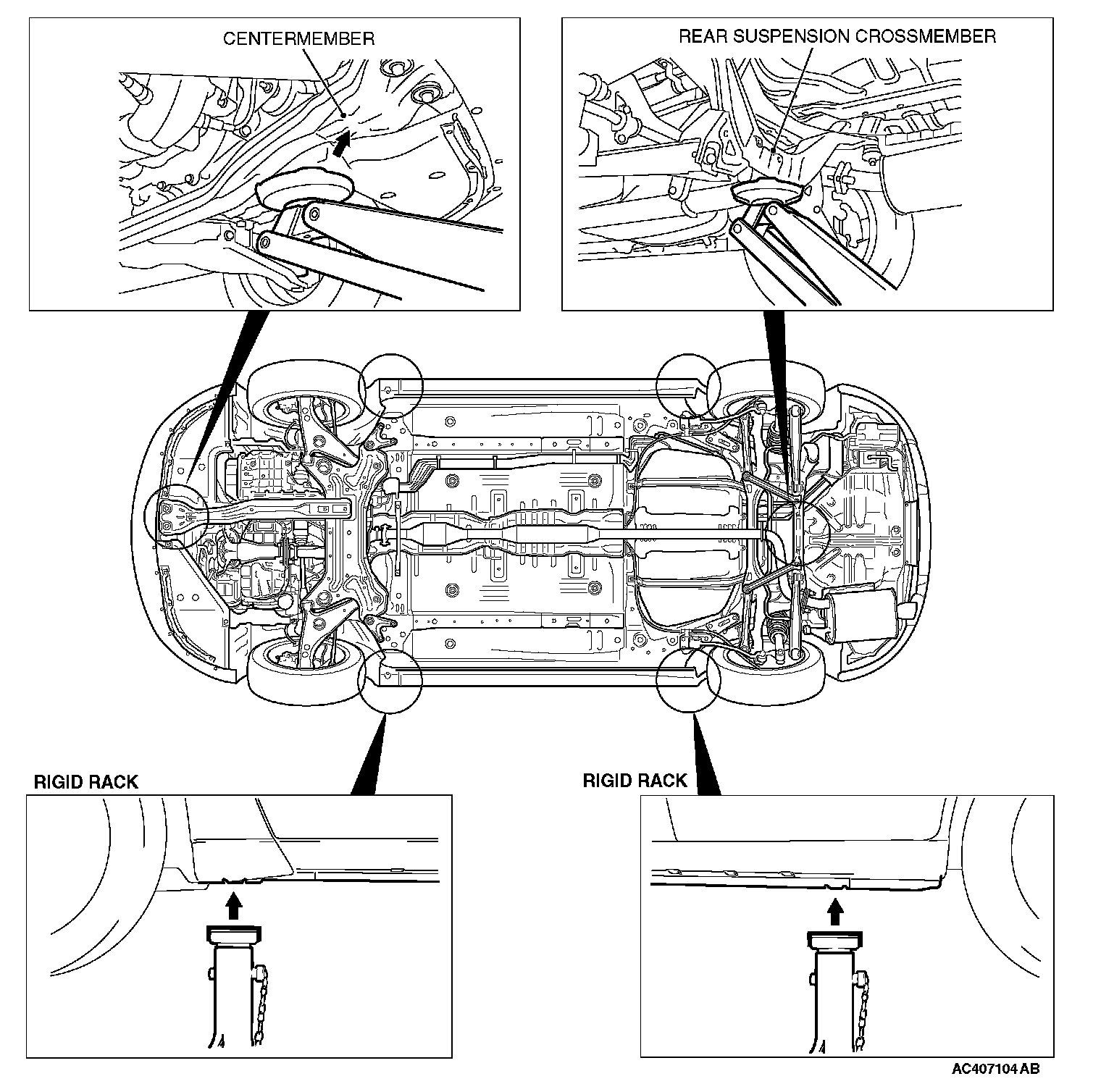 Special care should be taken when raising the vehicle on a frame contact type hoist. The hoist must be equipped with the proper adapters in order to support the vehicle at the proper locations.