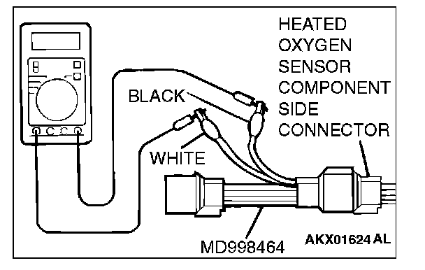 1. Disconnect the heated oxygen sensor connector and connect special tool MD998464 to the connector on the heated oxygen sensor side.