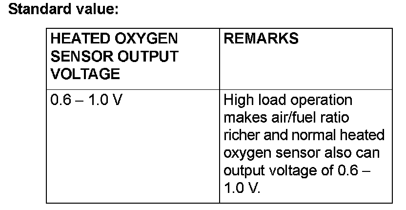 NOTE: If the temperature of sensing area does not reach the high temperature [of approximately 400 °C (752 °F) or more] even though the oxygen sensor is normal, the output voltage would be possibly low in spite of the rich air-fuel ratio.