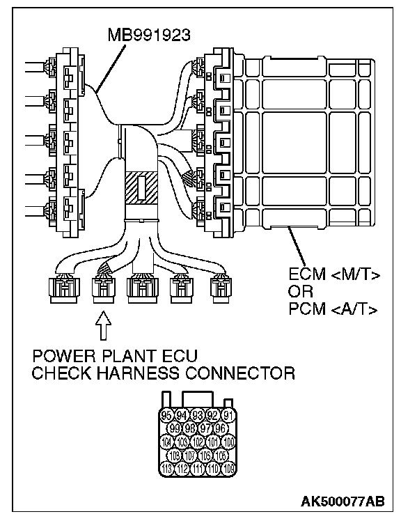 1. Disconnect all ECM [M/T] connectors or PCM [A/T] connectors. Connect the check harness special tool (MB991923) between the separated connectors.