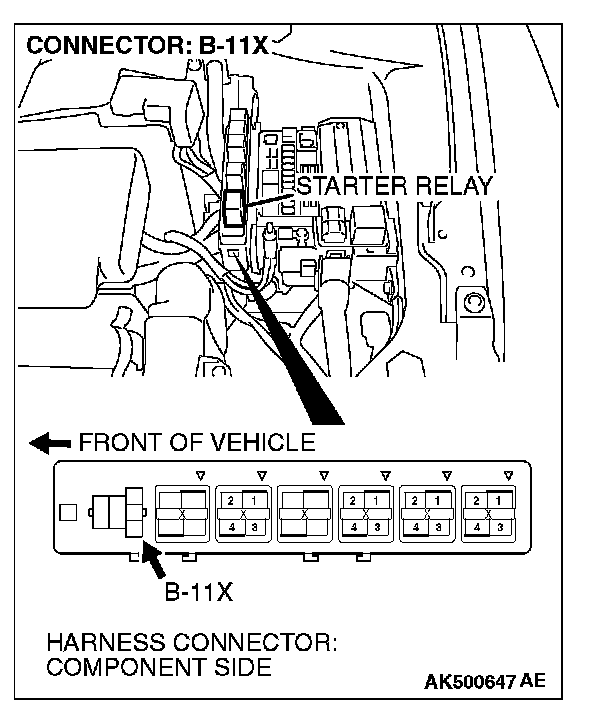 STEP 3. Measure the power supply voltage at starter relay connector B-11X.