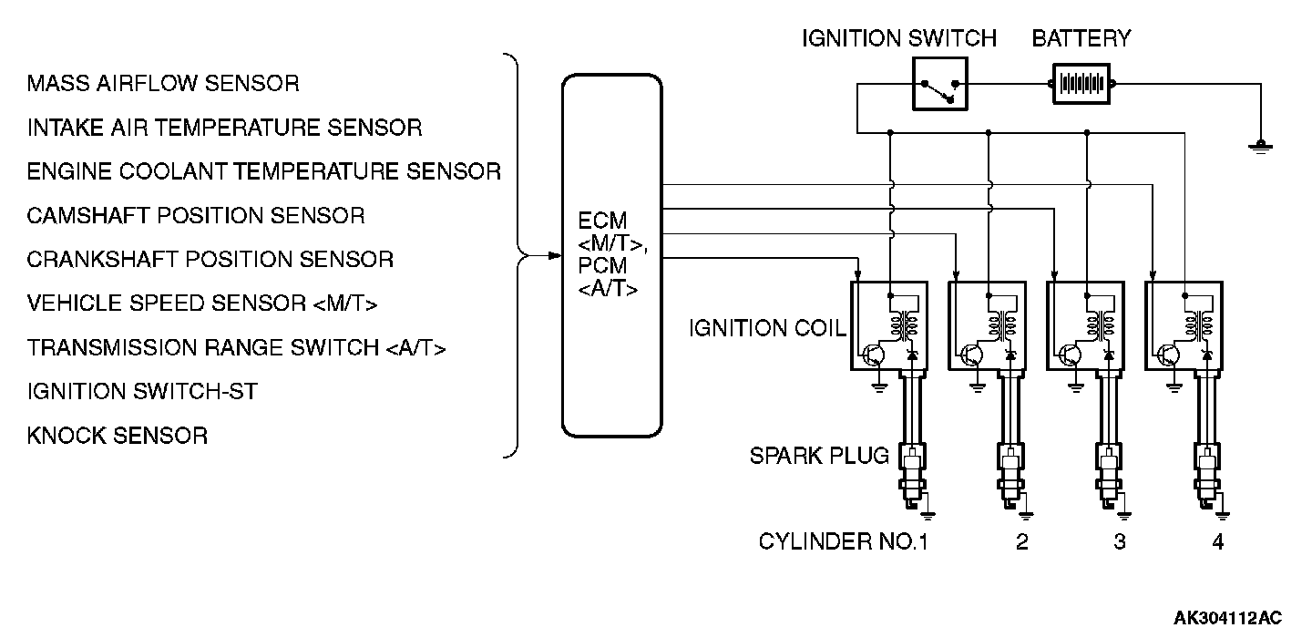The ECM or PCM determines which ignition coil should be controlled by means of the signals from the camshaft position sensor which is incorporated in the camshaft and from the crankshaft position sensor which is incorporated in the crankshaft.