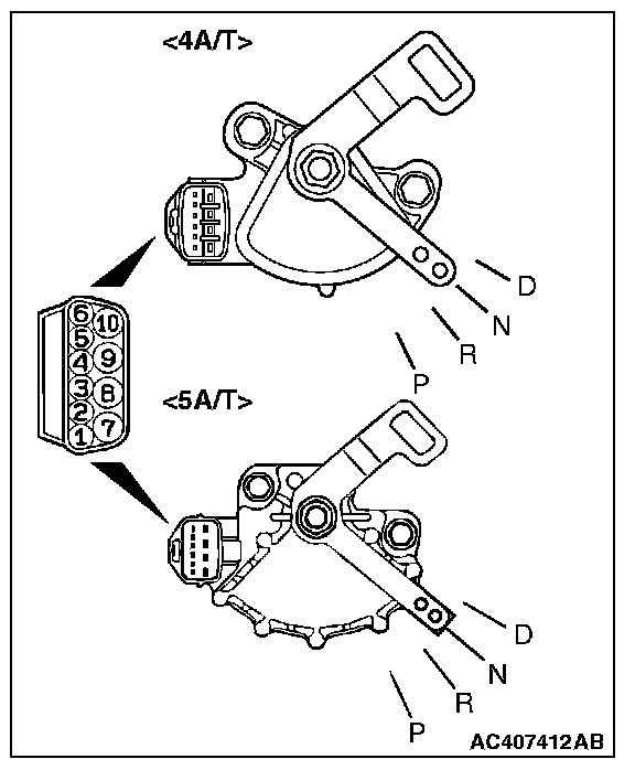 Move the selector lever to each position. The manual control lever position of the transmission range switch should match the transmission range.