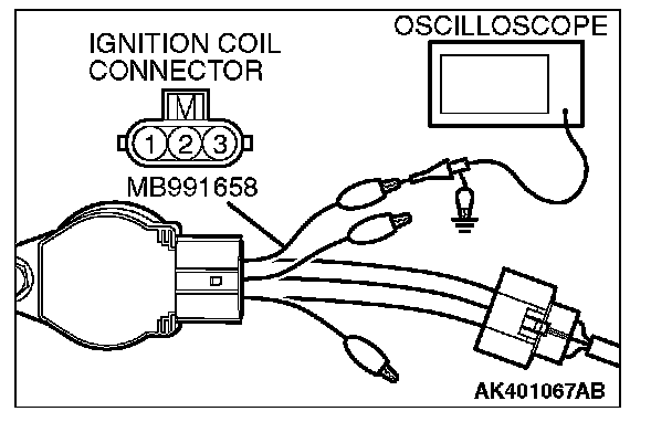 1. Disconnect the ignition coil connector, and connect the test harness special tool (MB991658) between the separated connector.