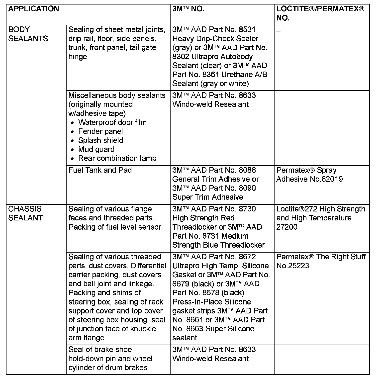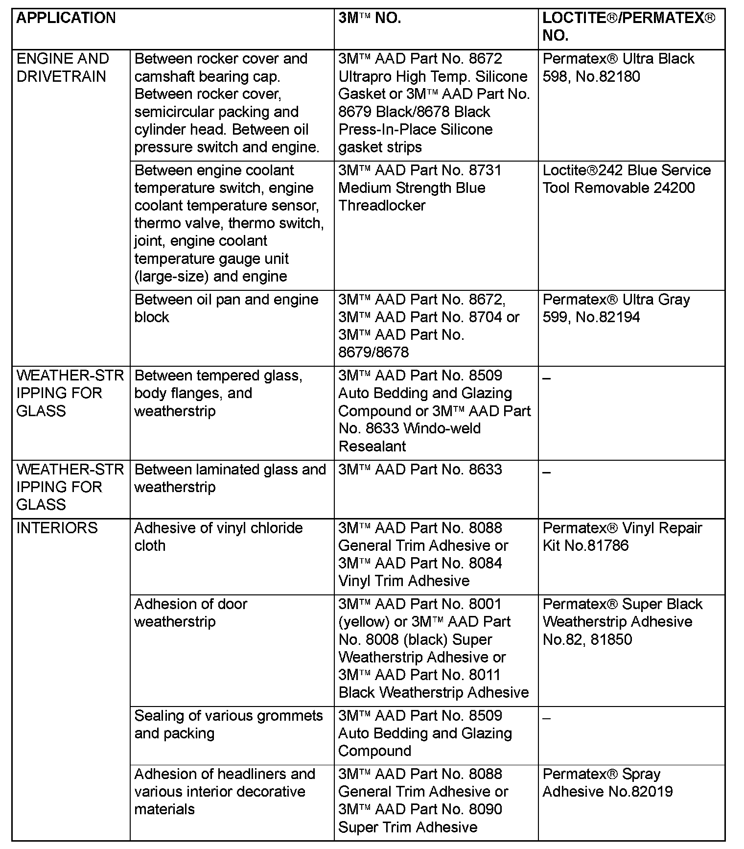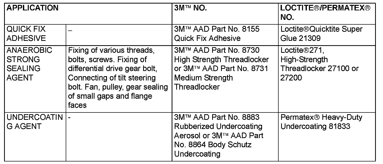 MAIN SEALANT AND ADHESIVE TABLE