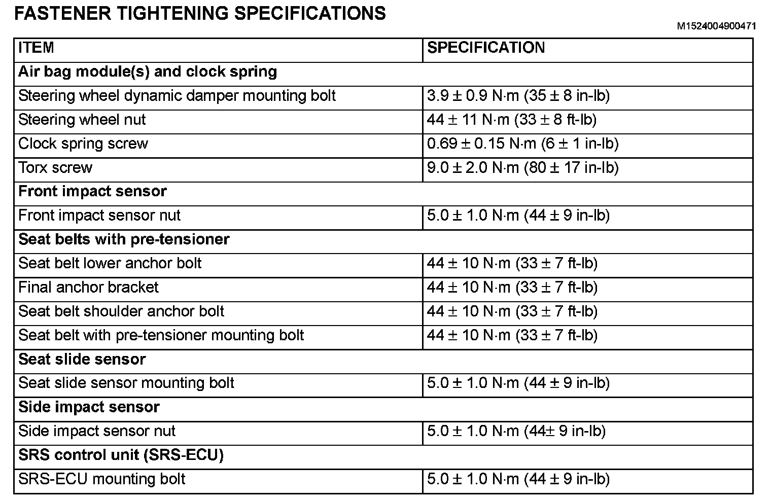 Fastener Tightening Specifications: