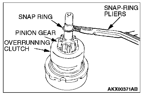 2. After removing the snap ring (by using snap-ring pliers), remove the stop ring and the overrunning clutch.